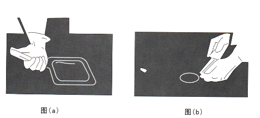 (1)根據蓋膠破損狀態(tài)可作圓形或菱形修補,沿破損輪廓四周至少15到20毫米,劃 出切割修補線(xiàn),如圖a,b,以45度角斜切并剝去已損壞的蓋膠,切割時(shí)注意不要損壞 下面的布層。